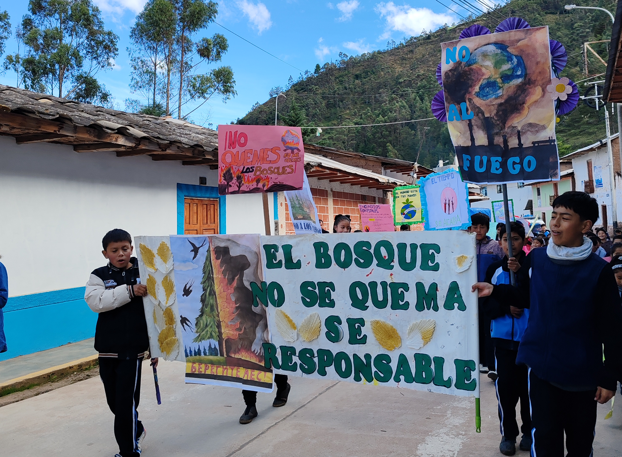 La jornada comenzó con un pasacalle lleno de energía y mensajes de conciencia ambiental, protagonizado por estudiantes de las instituciones: Nuestra Señora de Fátima, San Francisco de Asís y San Salvador, de los niveles primaria y secundaria, quienes recorrieron las principales calles del distrito con pancartas, carteles creativos y consignas contundentes como: “El fuego destruye lo que el bosque construyó”, “El futuro no se quema” y “Cuidar la jalca es proteger la vida”.