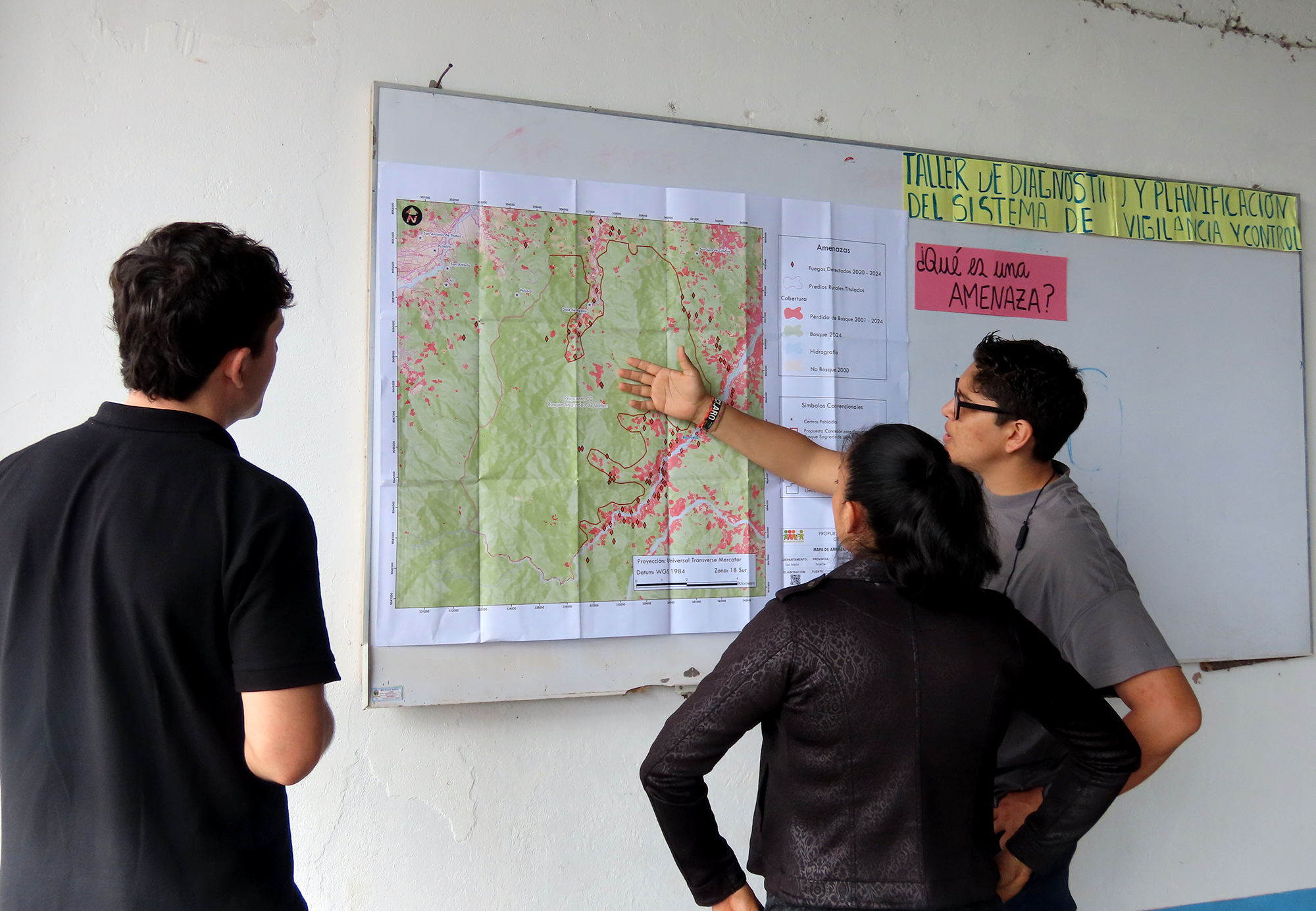 Durante los talleres se diagnosticaron los sistemas de vigilancia y control existentes, se actualizaron los planes de acción y se fortalecieron las capacidades para el monitoreo de biodiversidad utilizando herramientas como el aplicativo Merlin Bird ID, cámaras trampa y drones. A través de herramientas participativas como mapas parlantes, análisis FODA y dinámicas grupales, se identificaron más de las amenazas ambientales más ocurrentes en las cuatro concesiones, incluyendo deforestación, caza furtiva e incendios forestales. Así mismo, se formularon acciones estratégicas, entre ellas, instalación de hitos, patrullajes comunitarios, señalización de límites y campañas de sensibilización en las comunidades vecinas.